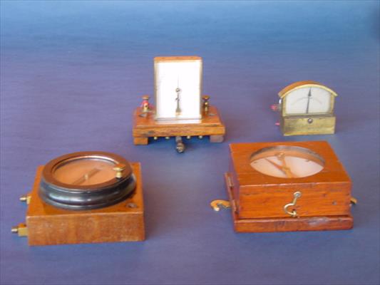 Four galvanometers. Bottom left, a typical Swiss design. Bottom right, a very old Breguet, and upper right one from the French army Telegraphe Militaire. 1