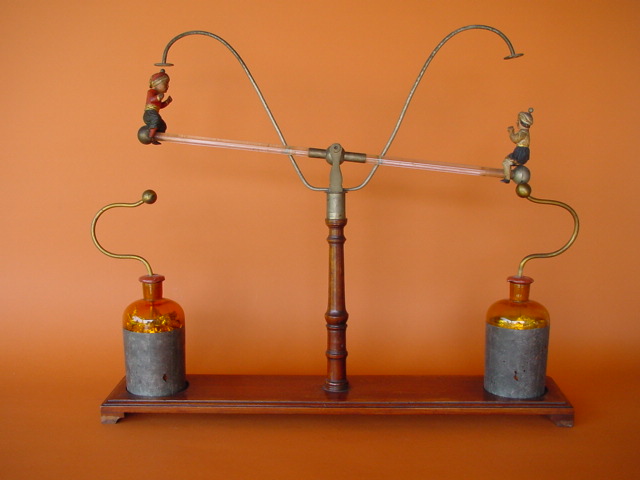 This is a unique electric see-saw balance (wip-wap) as it was used in the 19th century for demonstration of the electrical attraction and repulsion. It still works fine when the two Leyden jars are properly charged. 4