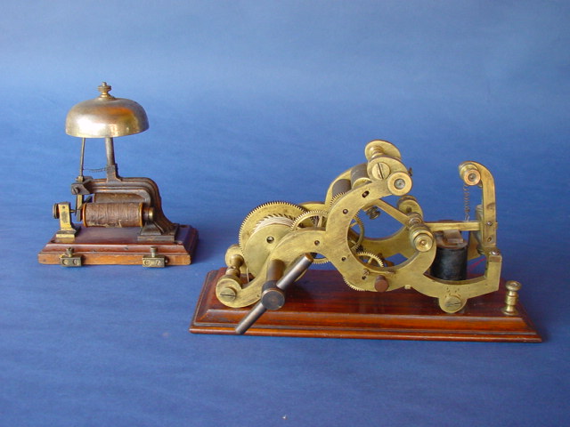 Tillotson weight driven embosser. The bell at the left is from an unknown maker. 6