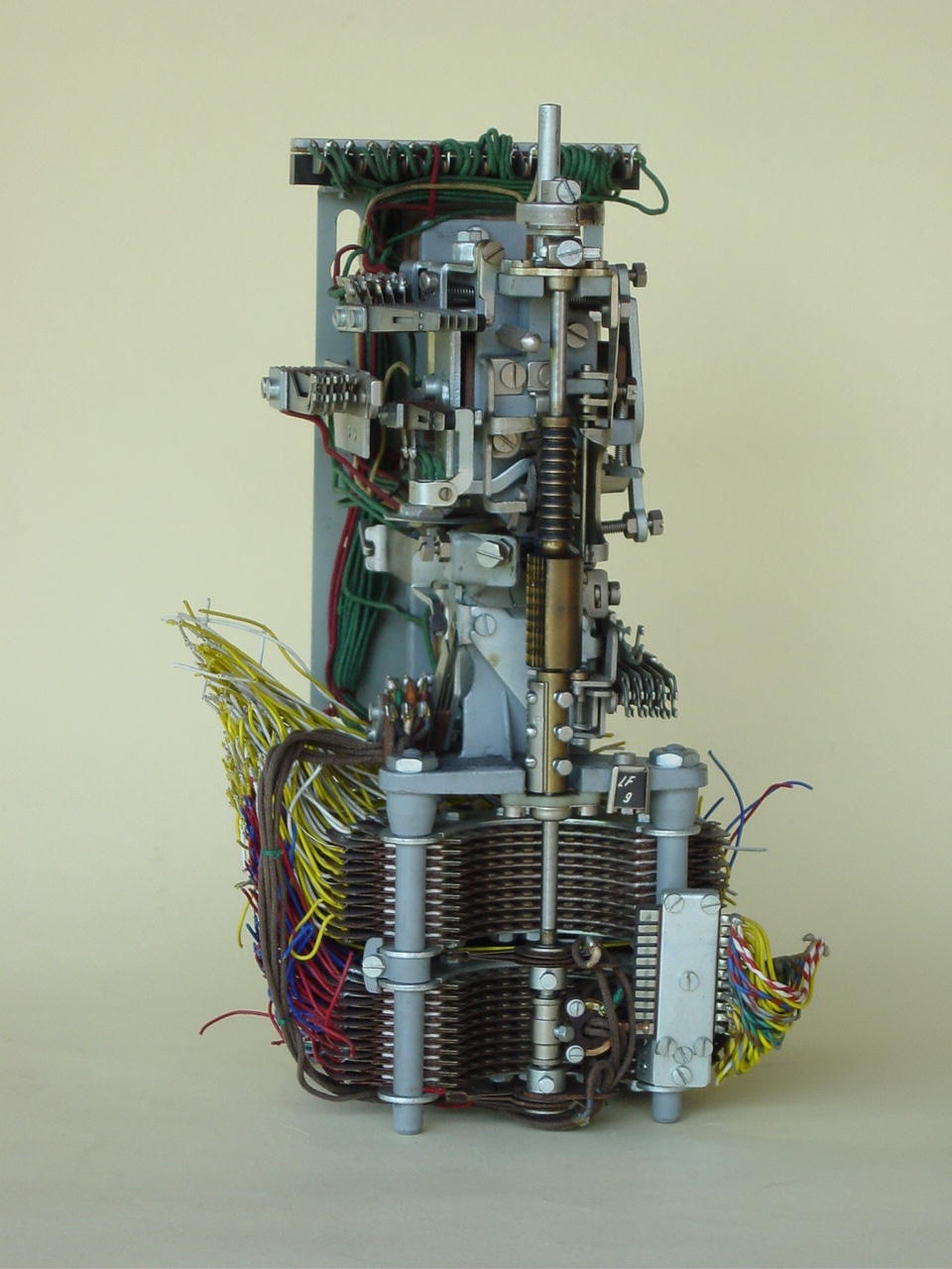 A dial element (goes up and down and rotates) of a Strowger exchange switch for automatic telephone dialing. 1